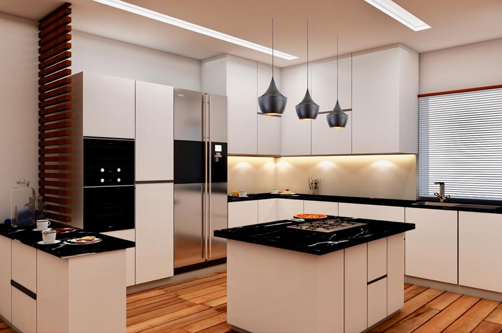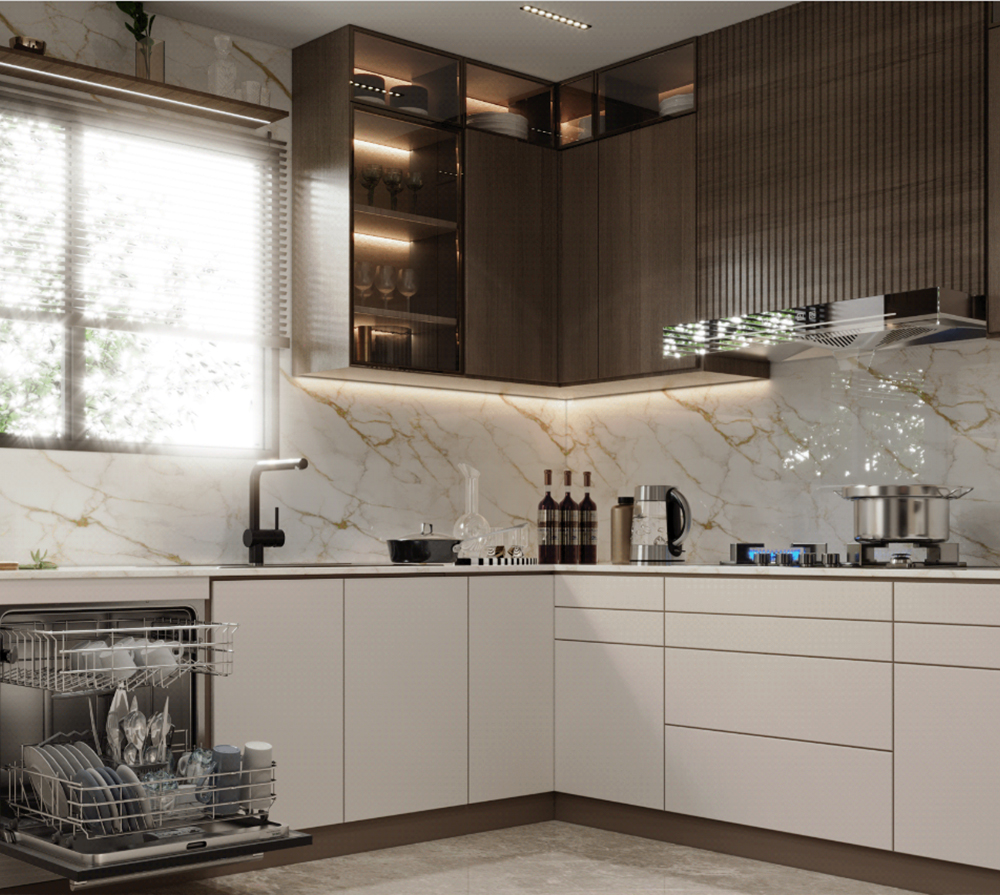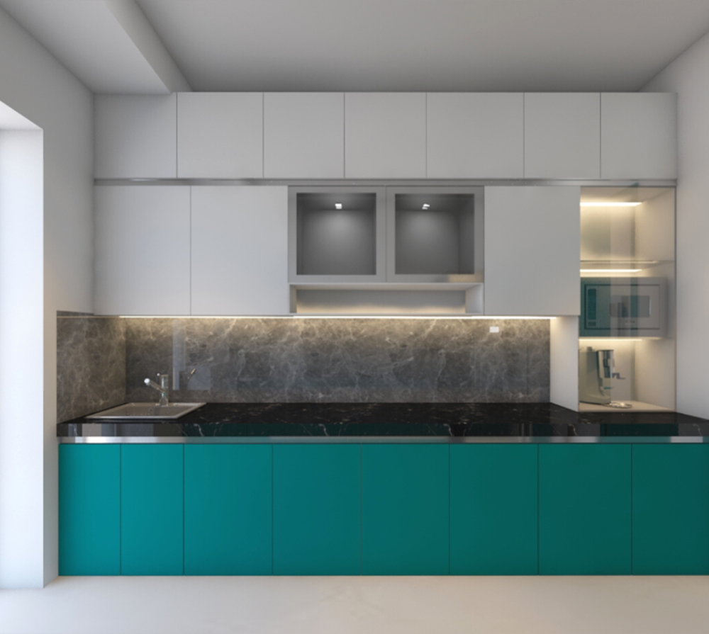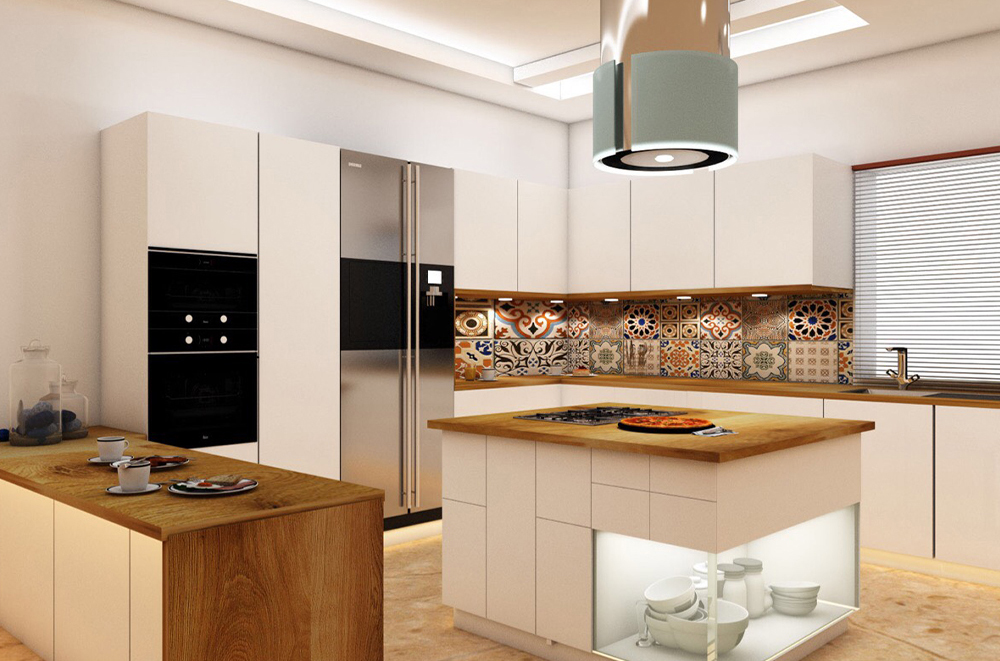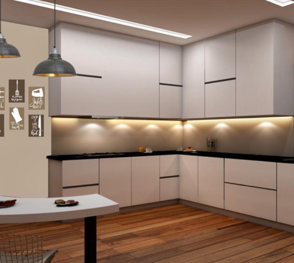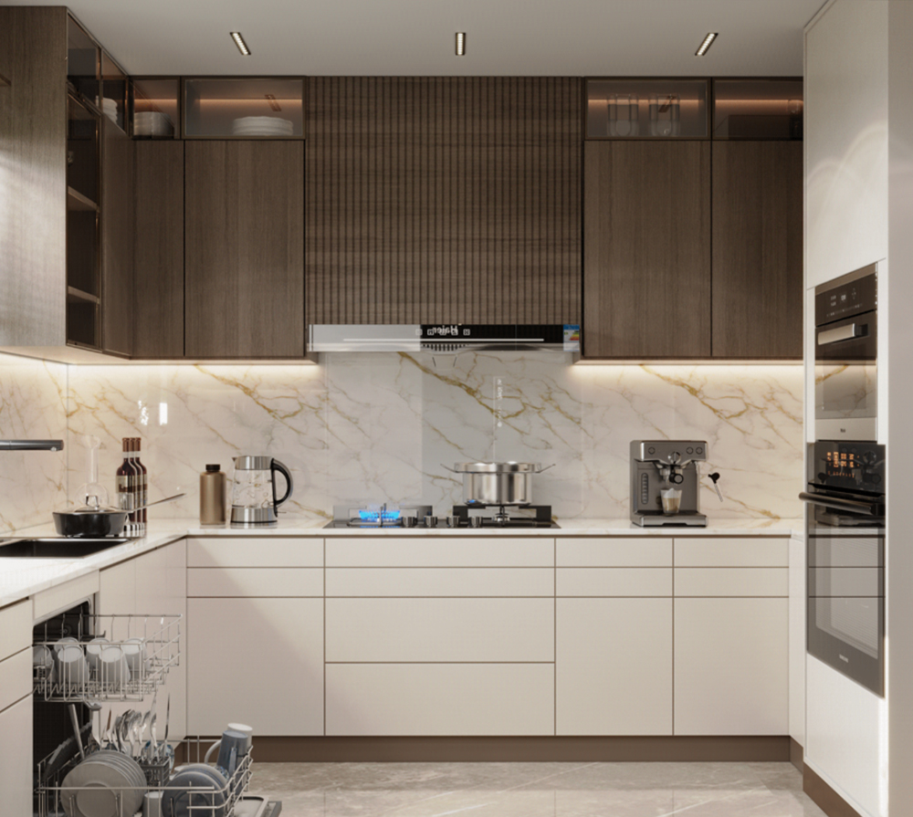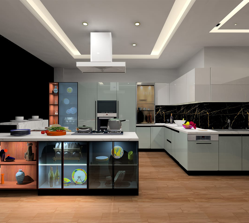 U-SHAPE KITCHEN : A U-shaped kitchen utilizes three walls to create a "U" shape. This layout maximizes storage and workspace, making it suitable for larger kitchens. It provides plenty of counter space and allows for a well-organized workflow, as each workstation can be placed on a separate wall. The U-shaped kitchen is ideal for multiple cooks or for those who require a significant amount of storage.