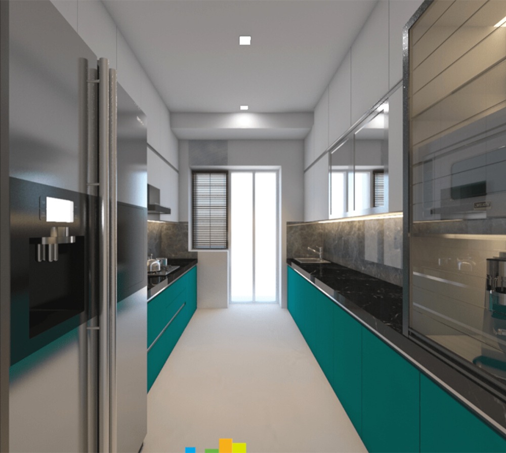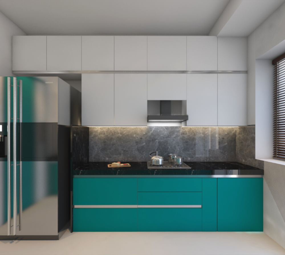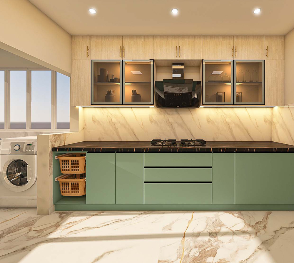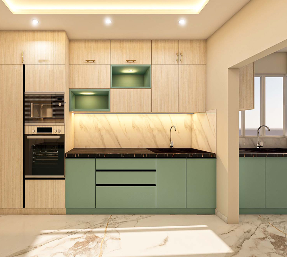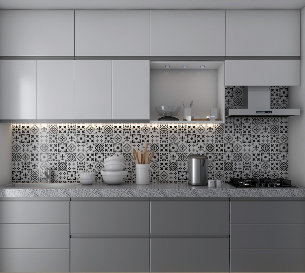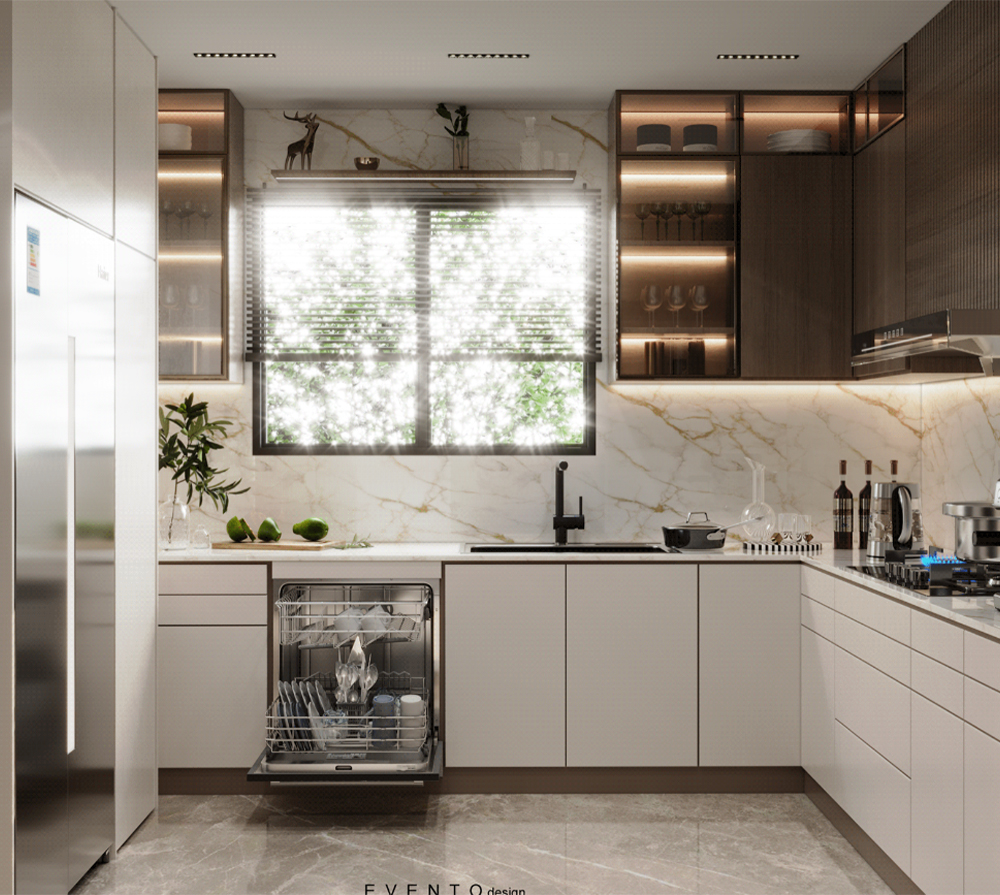 U-SHAPE KITCHEN : A U-shaped kitchen utilizes three walls to create a "U" shape. This layout maximizes storage and workspace, making it suitable for larger kitchens. It provides plenty of counter space and allows for a well-organized workflow, as each workstation can be placed on a separate wall. The U-shaped kitchen is ideal for multiple cooks or for those who require a significant amount of storage.